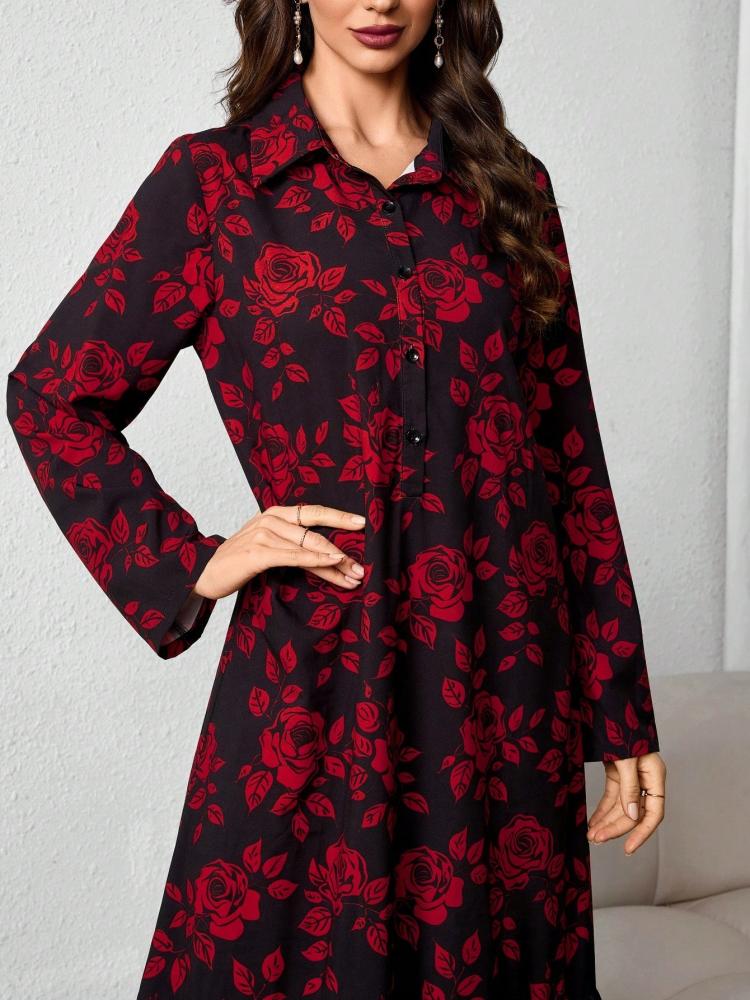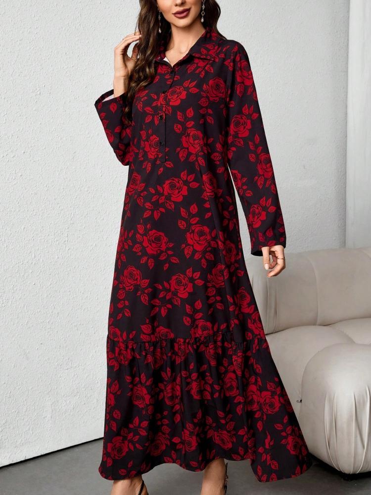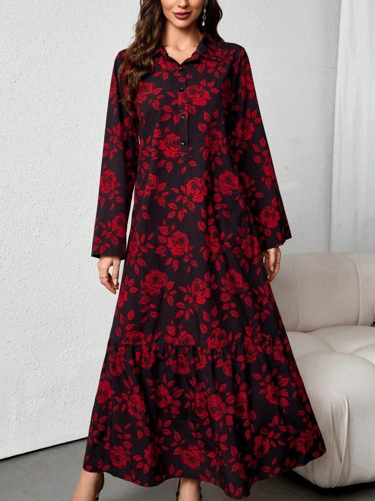 الفستان الأنيق يتميز بطبعة ورود حمراء جذابة على خلفية داكنة، مما يضفي عليه مظهرًا أنثويًا وجذابًا. تصميمه الطويل مع ياقة قميص وأكمام طويلة يجعله مناسبًا لمختلف المناسبات.